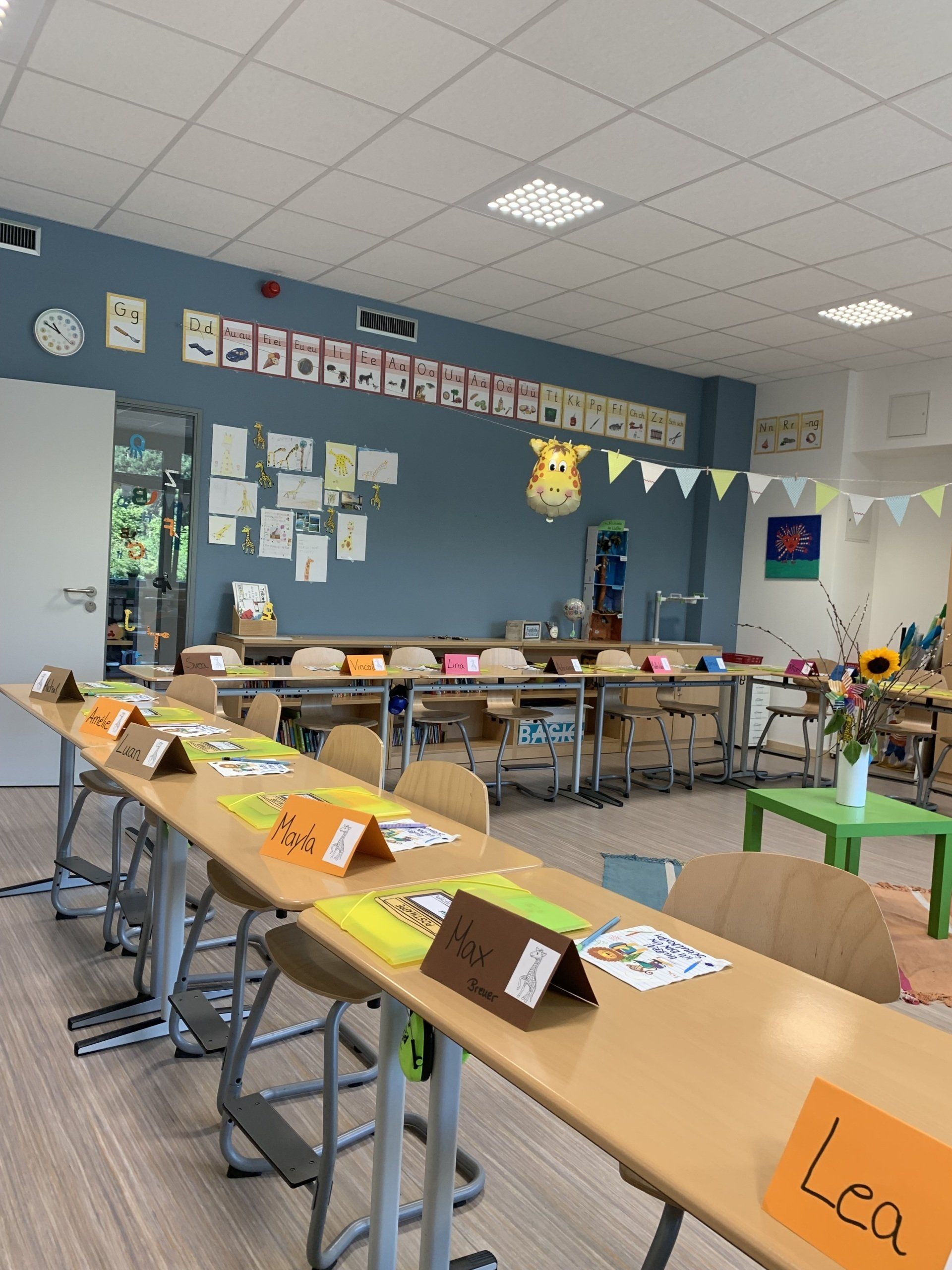 Wir hatten eine tolle Einschulungsfeier und haben uns gefreut, dass wir ein so großes Klassentier bei uns haben: Gerti die Giraffe. In den Ferien hat Gerti sogar Nachwuchs bekommen. Nun haben wir eine Baby-Gerti bei uns im Klassenraum. Bald dürfen wir sie auch mal mit nach Hause nehmen!