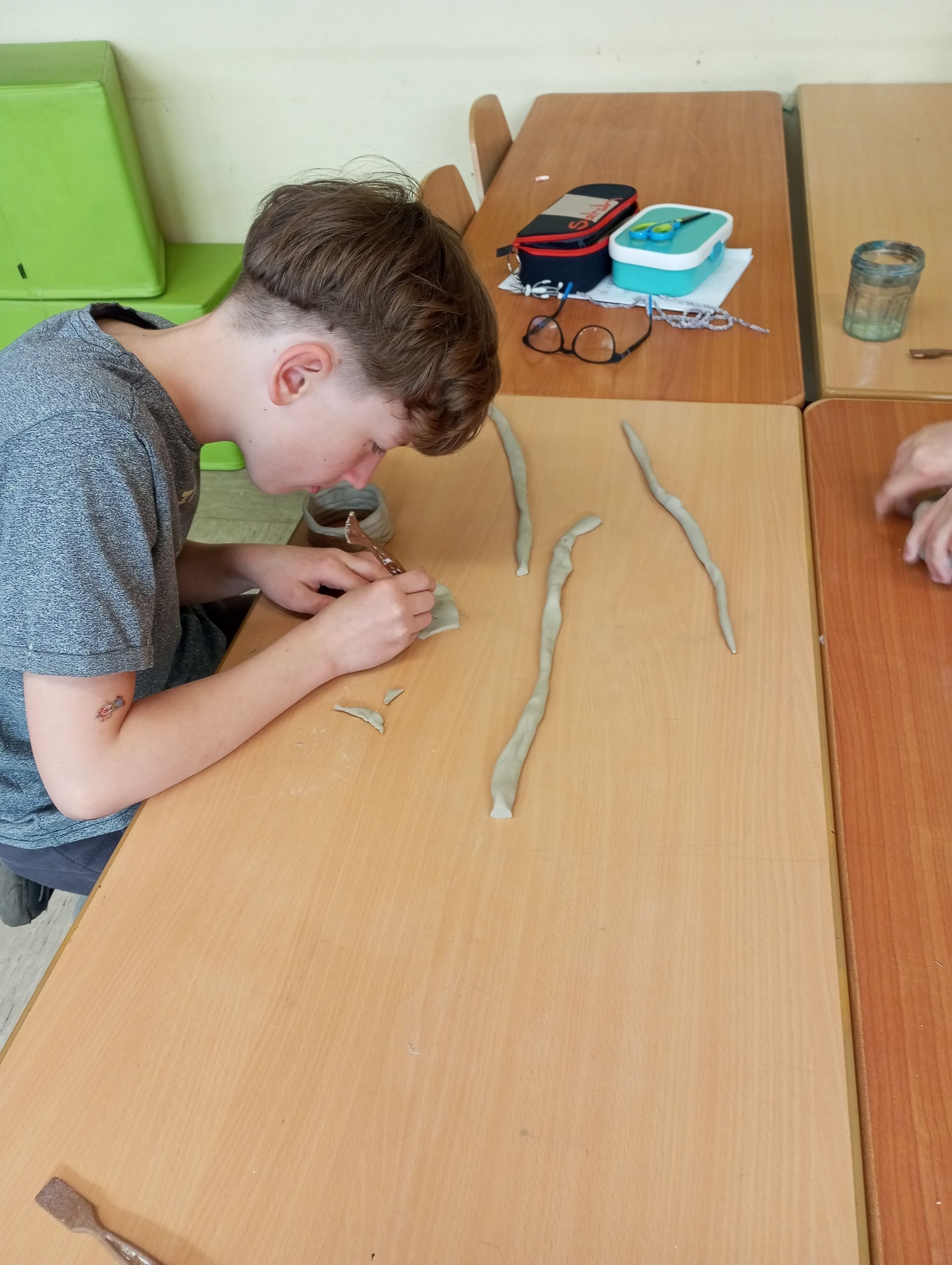 Tag 4: Wie an allen Tagen haben wir mehr über das Leben von Helen Keller erfahren. Danach sind wir in den Schulgarten gegangen und haben eine Rallye gemacht. Wir mussten verschiedene Dinge suchen und darauf achten, wie sie sich anfühlen – ob sie rund, glatt, kalt oder glitschig waren. Das war richtig spannend! Außerdem haben wir auch mit Modelliermasse Tiere und andere Dinge gestaltet. Manche Tiere konnten wir allein durch das Fühlen gut erkennen.