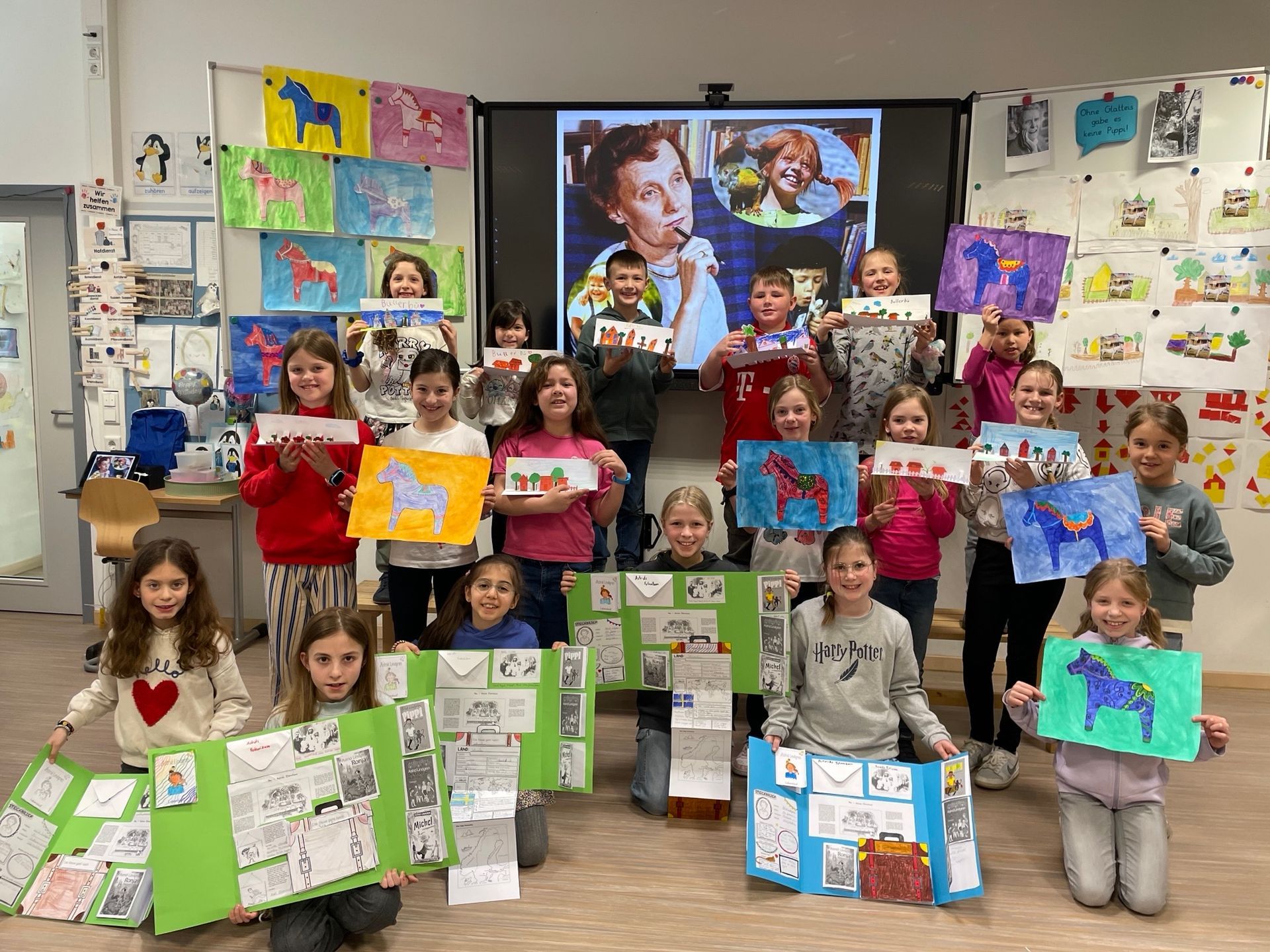 „In der Projektwoche waren wir in der Gruppe „Astrid Lindgren“. Sie hat viele verschiedene Kinderbücher geschrieben. Bekannt sind z.B. Pippi Langstrumpf, Ronja Räubertochter, Michel aus Lönneberga und Madita.“ (Sophia und Franzi)