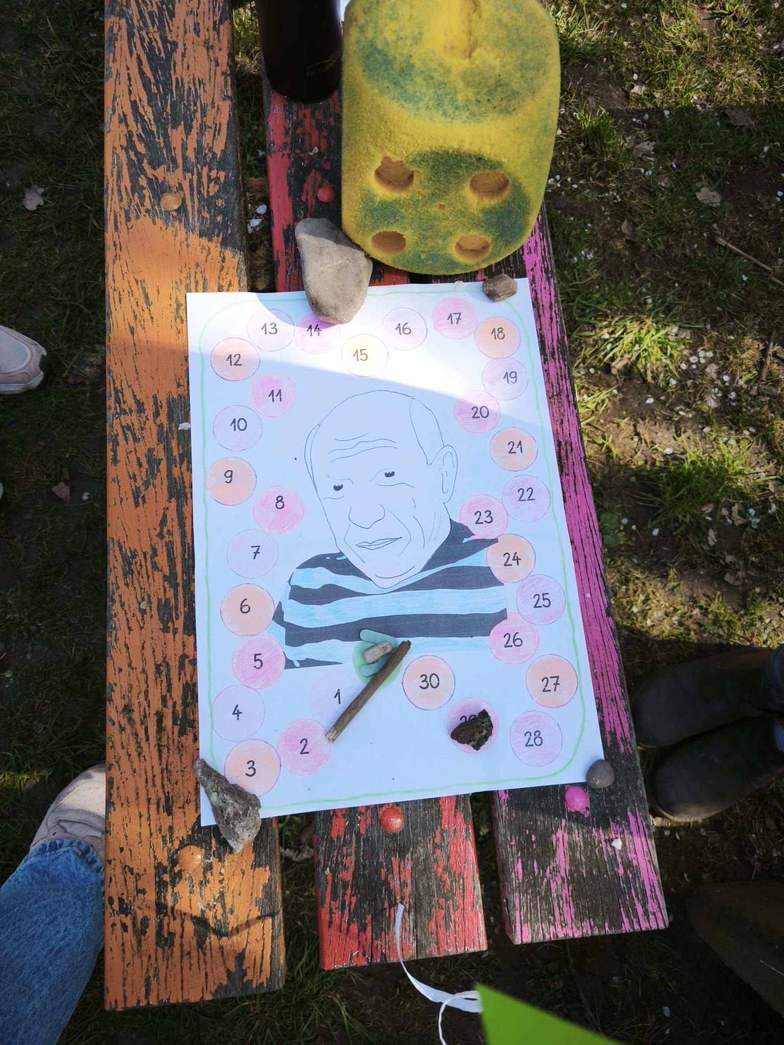 Am Donnerstag ging es um Zufall und Chaos. Wir haben Picassogesichter "erwürfelt“, wodurch der Zufall über Kopfform, Augen, Nase, Ohren und Mund entschied. Außerdem lernten wir durch ein Spiel im Schulgarten noch mehr über Picasso und sein Leben - und das bei schönstem Wetter! Am Abschlusstag schauten wir uns Picassos berühmte Ein-Linien-Bilder genauer an und gestalteten auch hierzu eigene Werke. Zudem hatten wir die Möglichkeit, die Kunstwerke der letzten Tage fertigzustellen und unseren großen Steckbrief rund um Picasso zu vollenden.